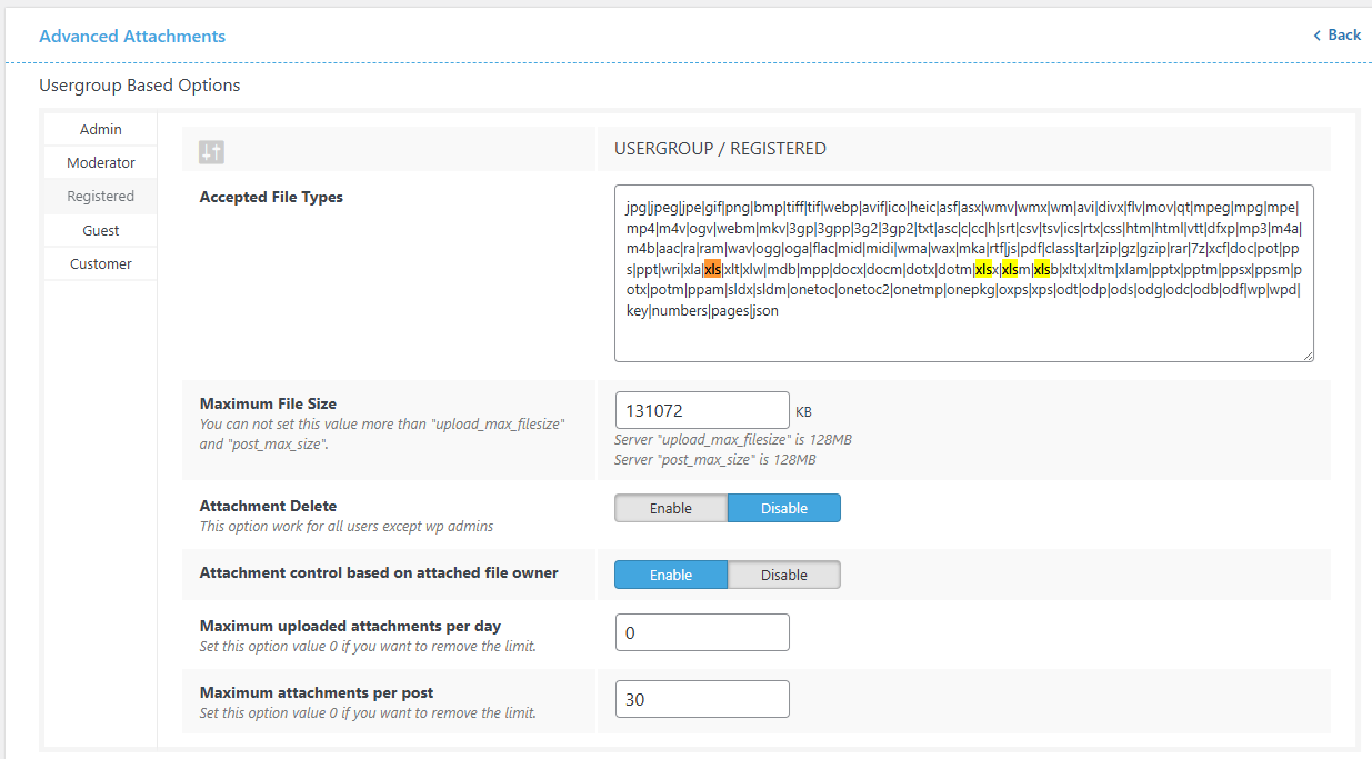 2. Registered users have all the blocked file extensions in the list of Accepted File Types