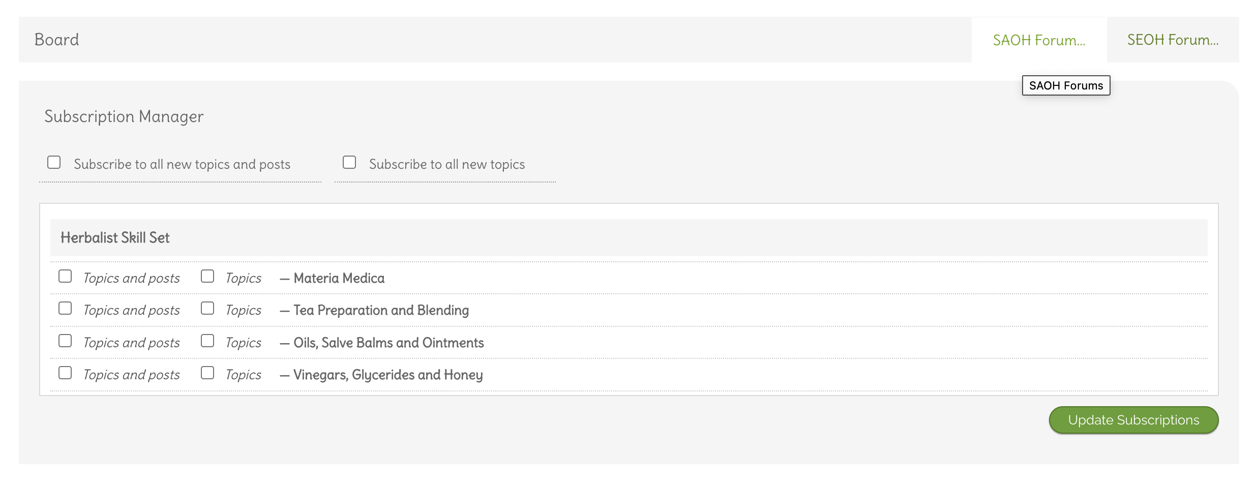 In the first forum board (SAOH Forum), the Subscription Manager has the following (also shown in attached photo):