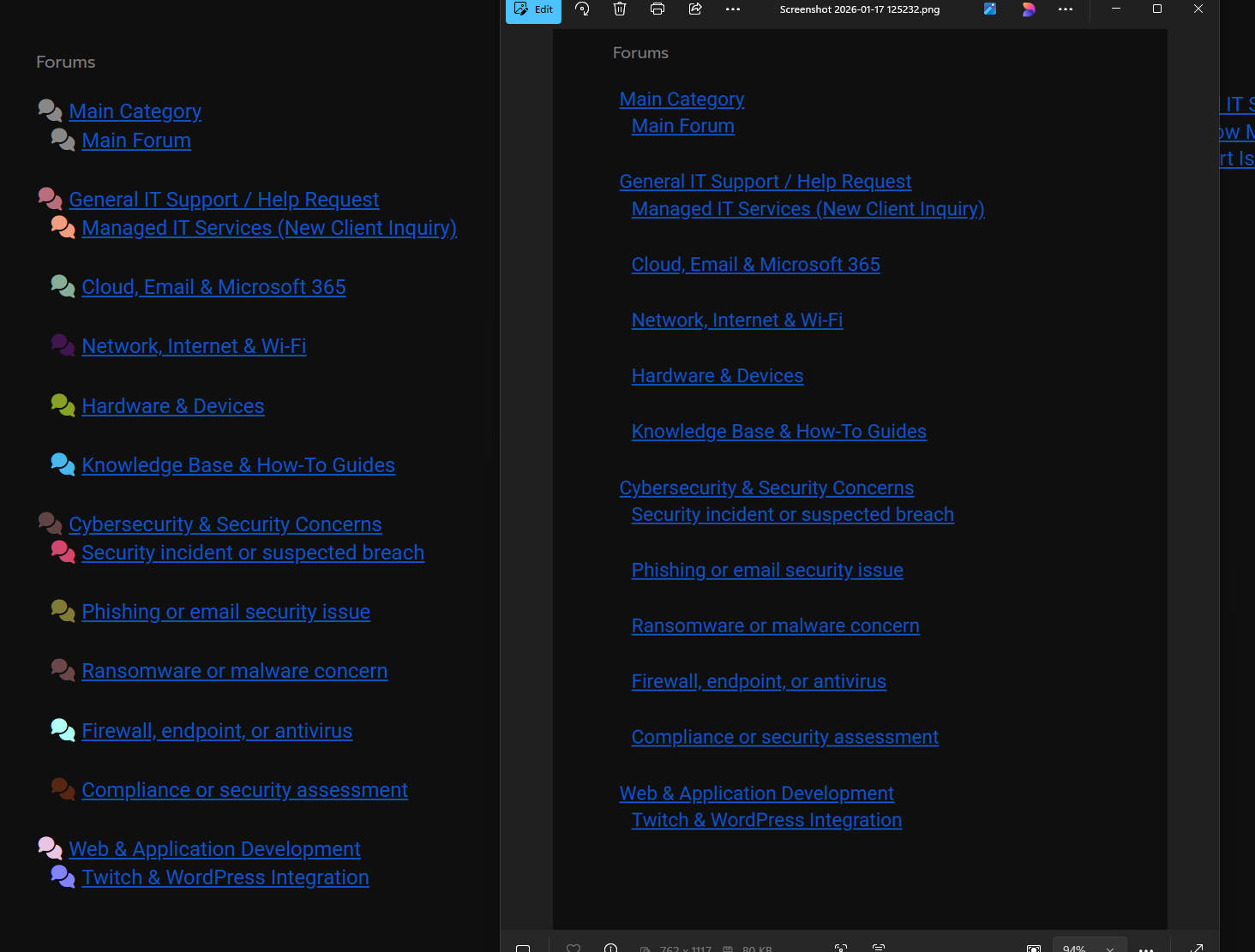In Elementor edit mode, the forum list displays correctly (icons, spacing, parent/child hierarchy).