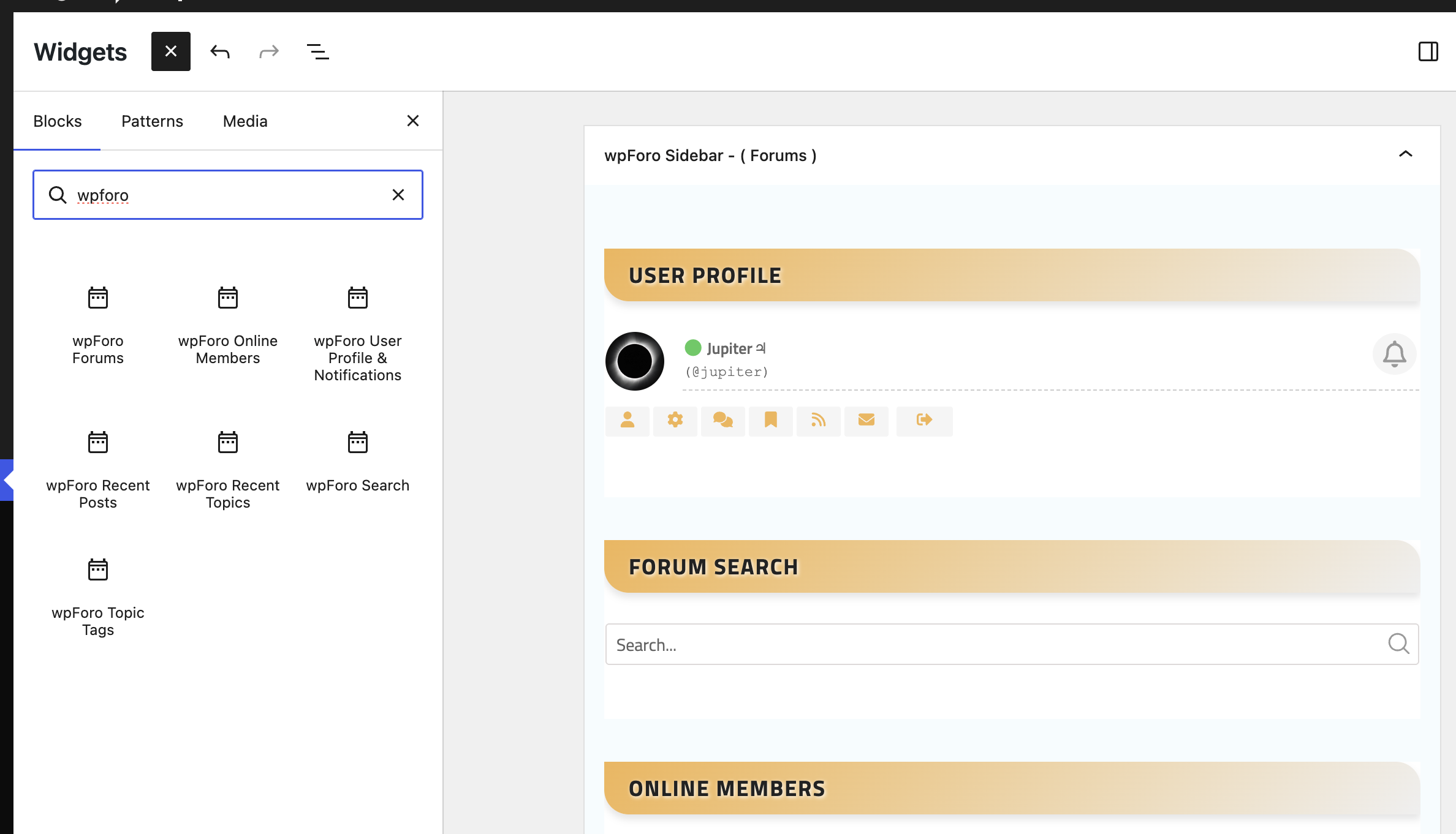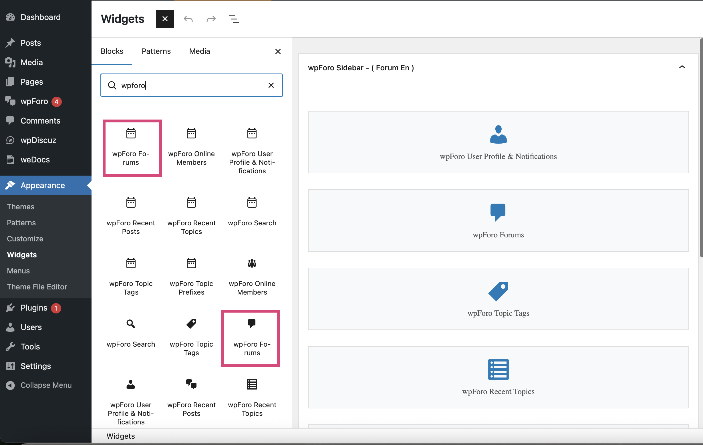 Both types of each wpForo widgets are there, you can find the same widget as legacy and as block widget: