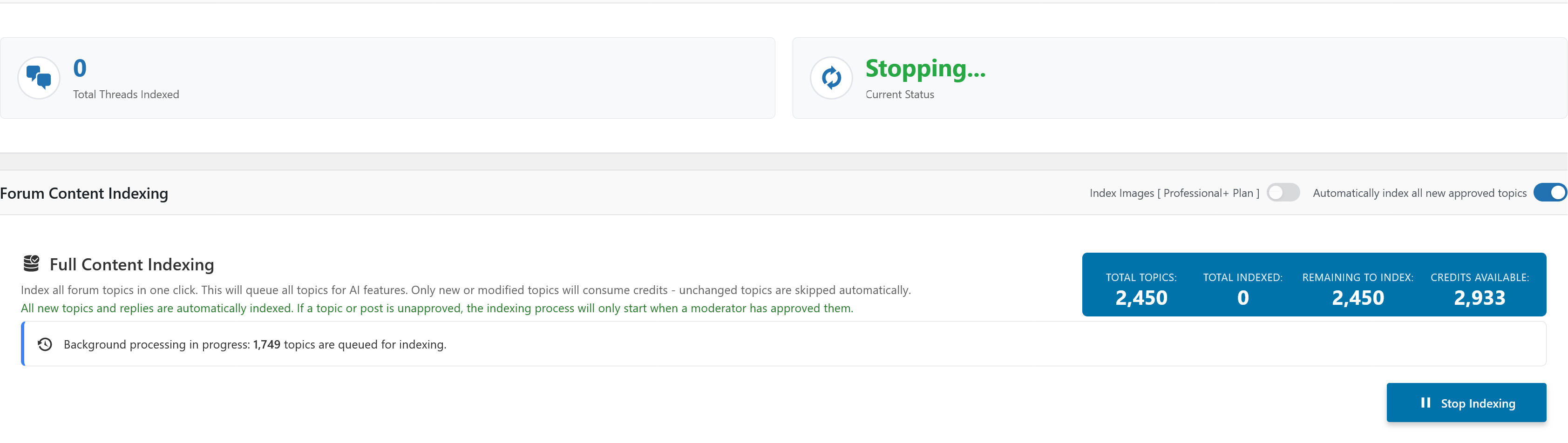 - When I hit Ctrl+F5 and then start reindex one forum it's says currently indexing for 1s and then Stopping without doing any indexing.