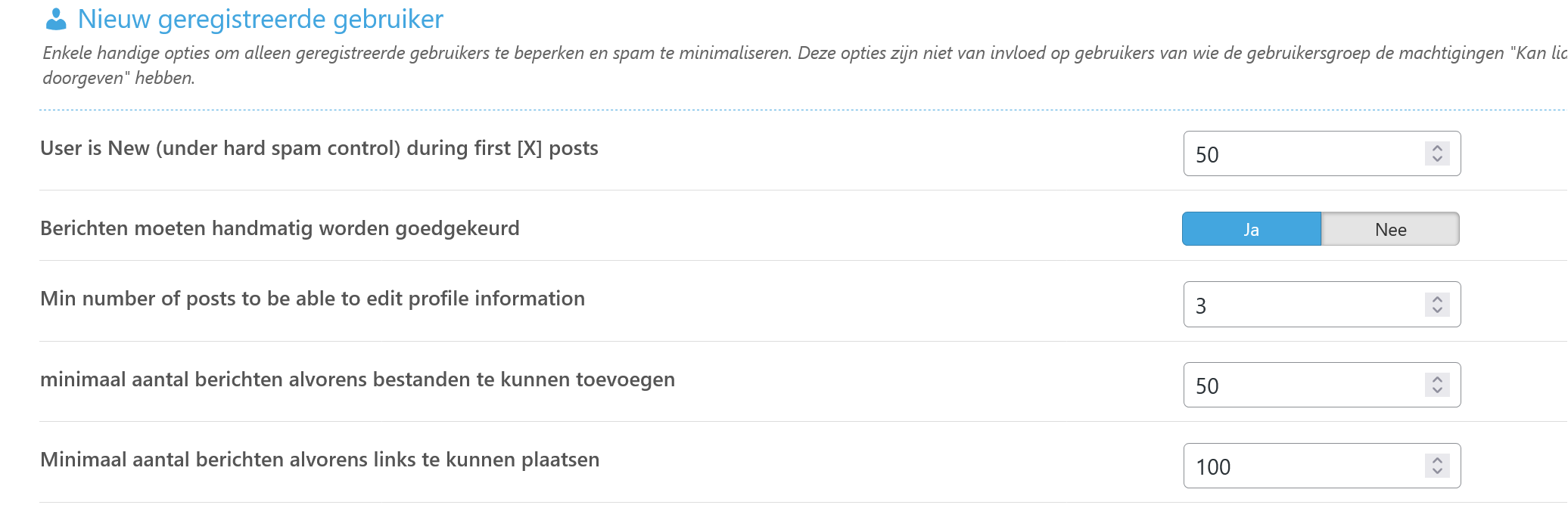 This option is related to “new” users. A “new” user is someone who has not yet reached the minimum number of approved posts. The minimum number is defined in the previous option: “User is New (under hard spam control) during first [X] posts.”