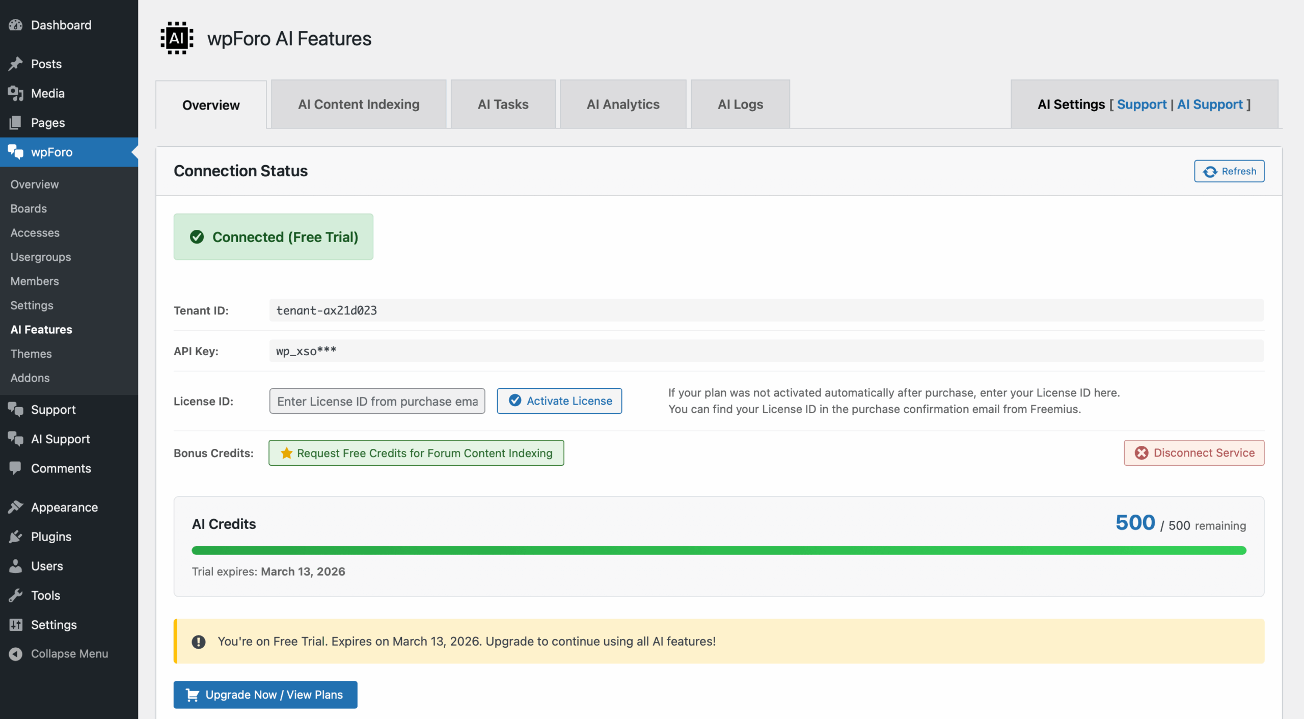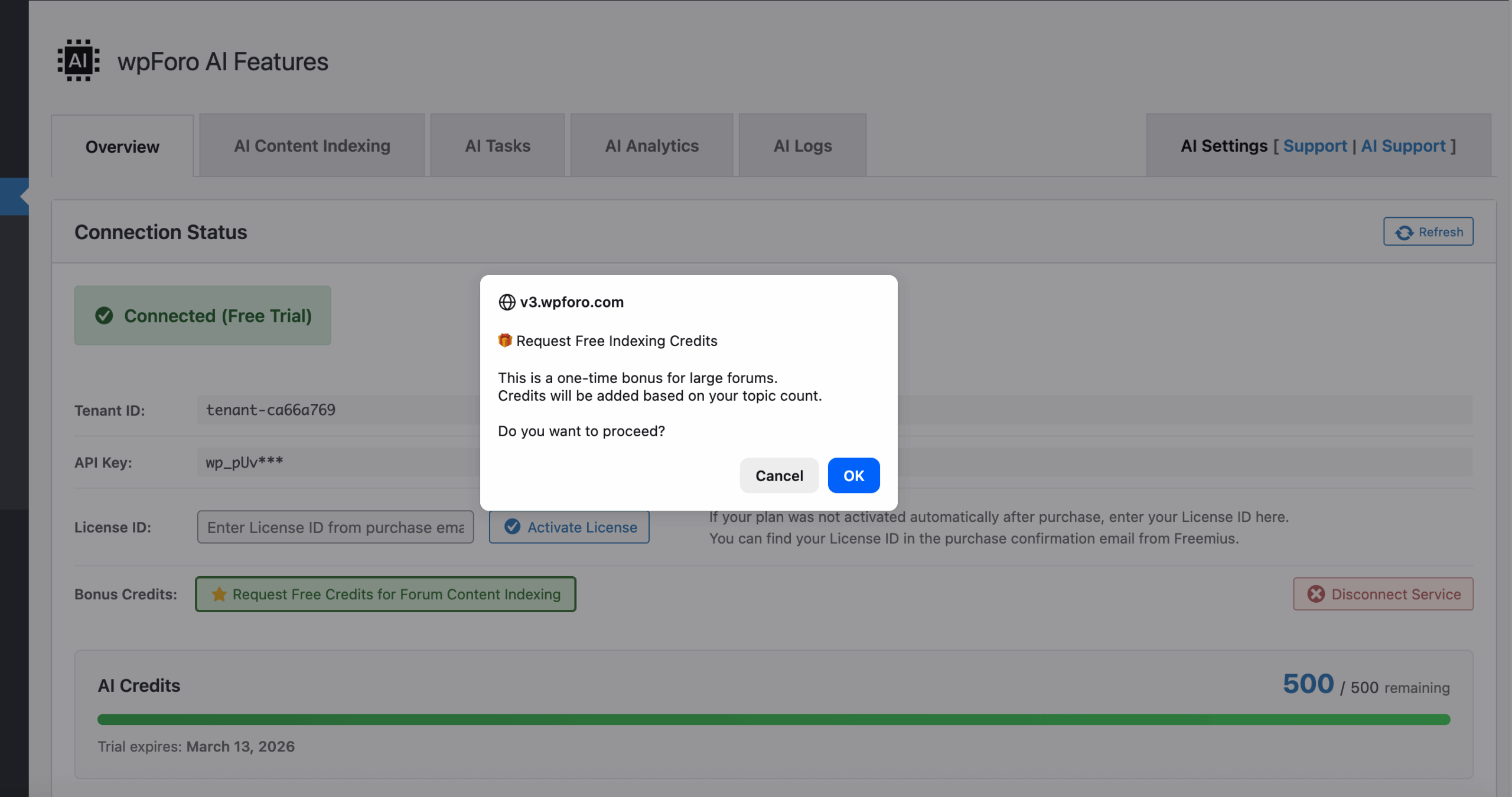 Once you connected your real forum to AI API you'll see a button for bonus credits to index your topics for free like this: