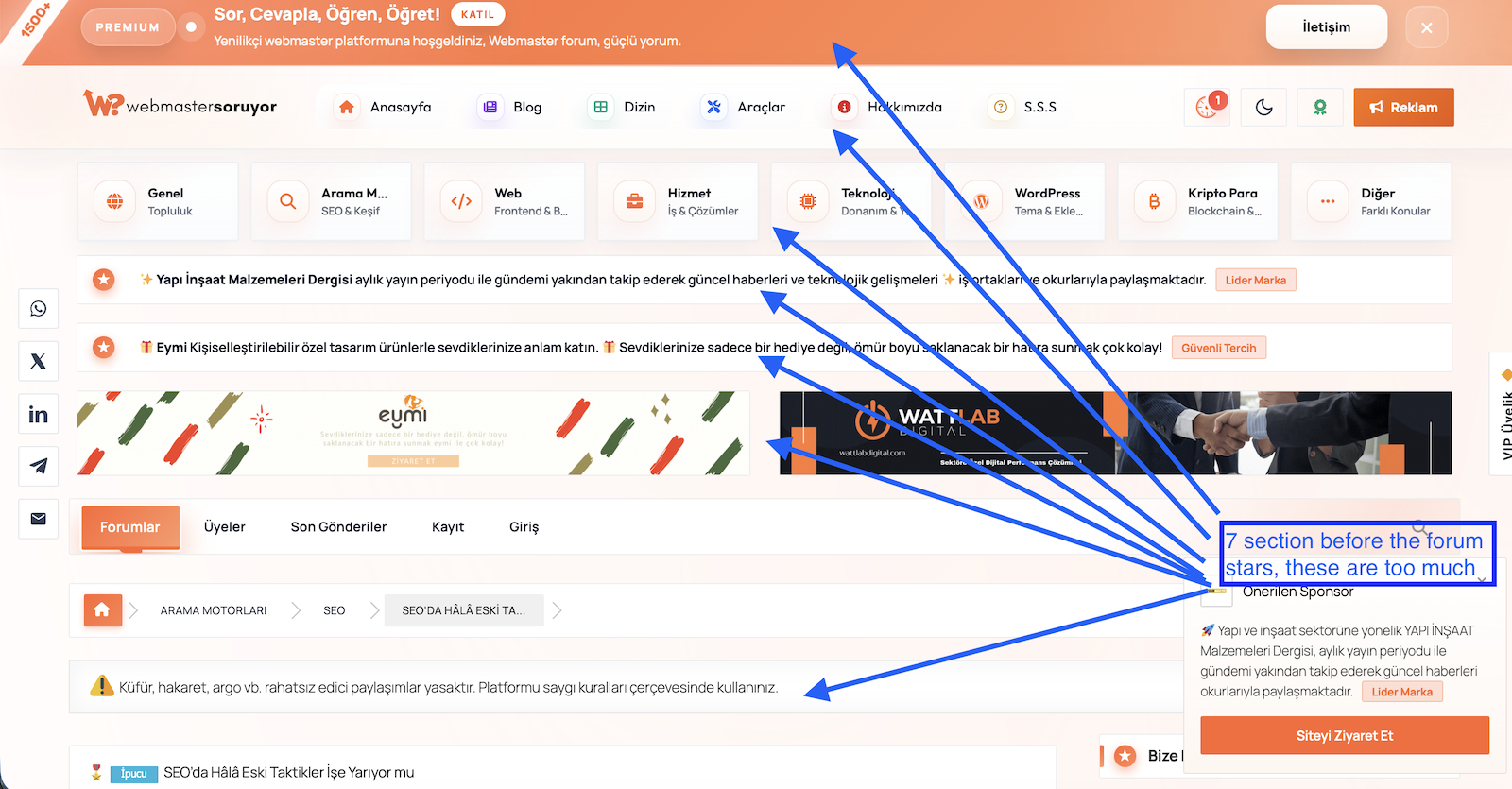 However I see multiple row of section on top of the forum that could annoy regular user, on every refresh user must scroll over lots of information sections. You should consider remove at least 3 sections from the header area.