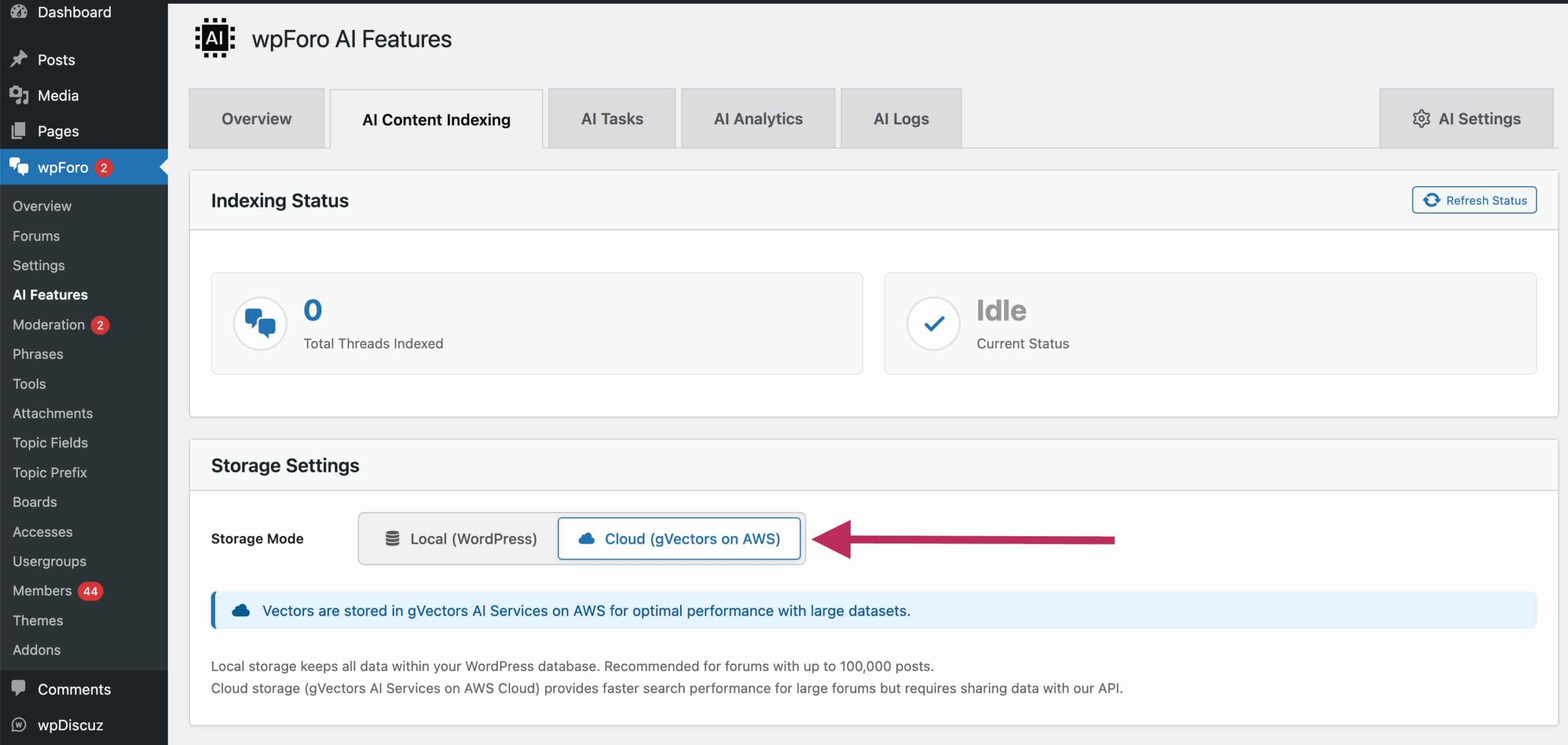- Choose Your Storage Mode Go to wpForo Settings > AI Features and select either Local or Cloud (gVectors on AWS) storage mode. For forums over 50,000 posts, we recommend Cloud.