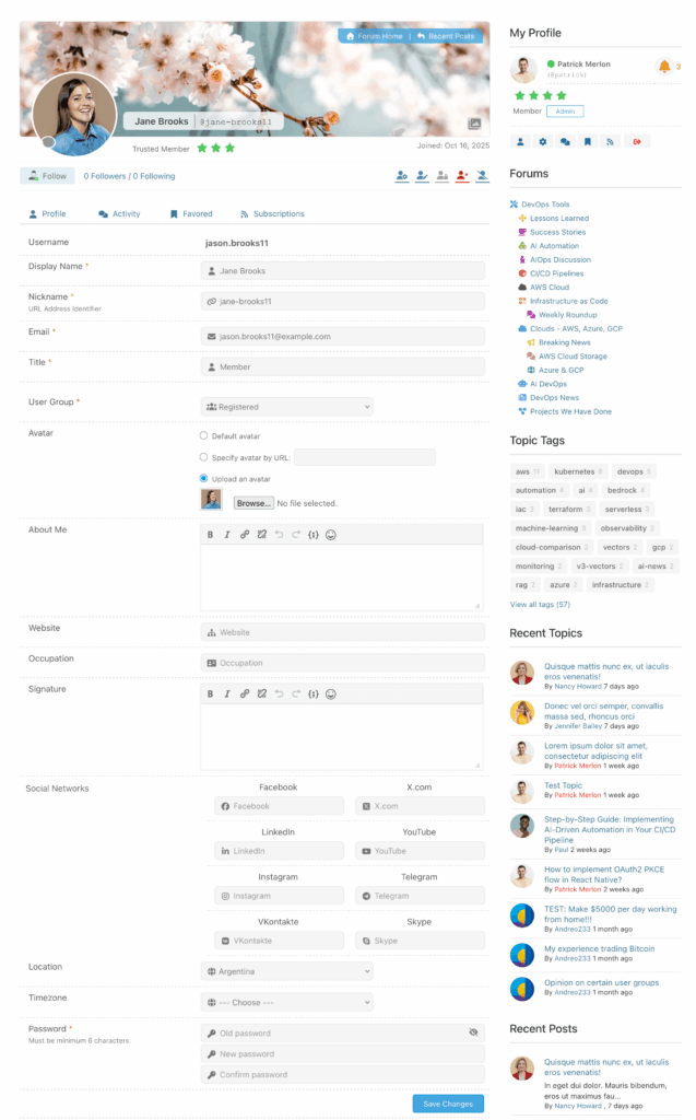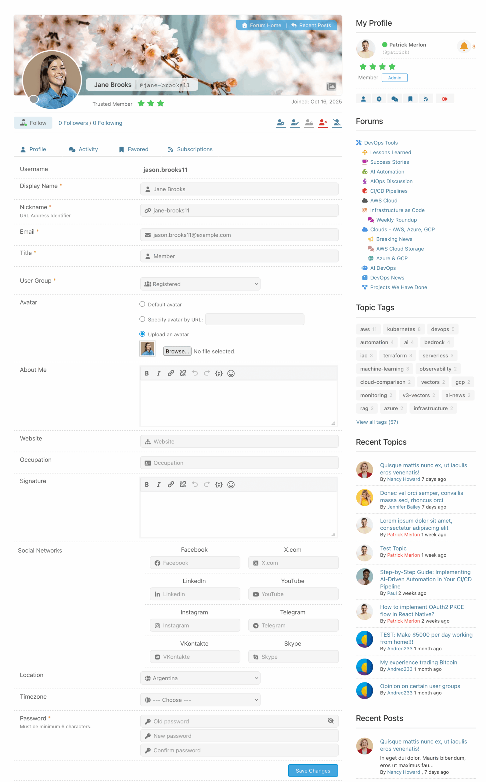 On this subPage of Member Profile users can edit profile information, change Avatar, Timezone and Signature. All data (except username) are available for managing here. Only Usergroup setting is available for admins and moderators.
