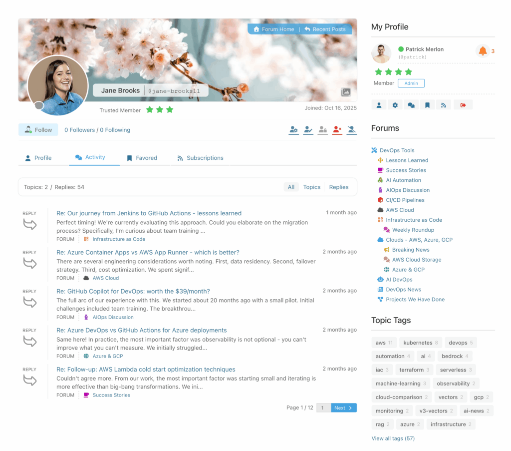Here you can see member topics and posts. This page is also under improvement. It’s planned to display as much as possible activity information. Also it will be integrated with Profile Plugins user activities.