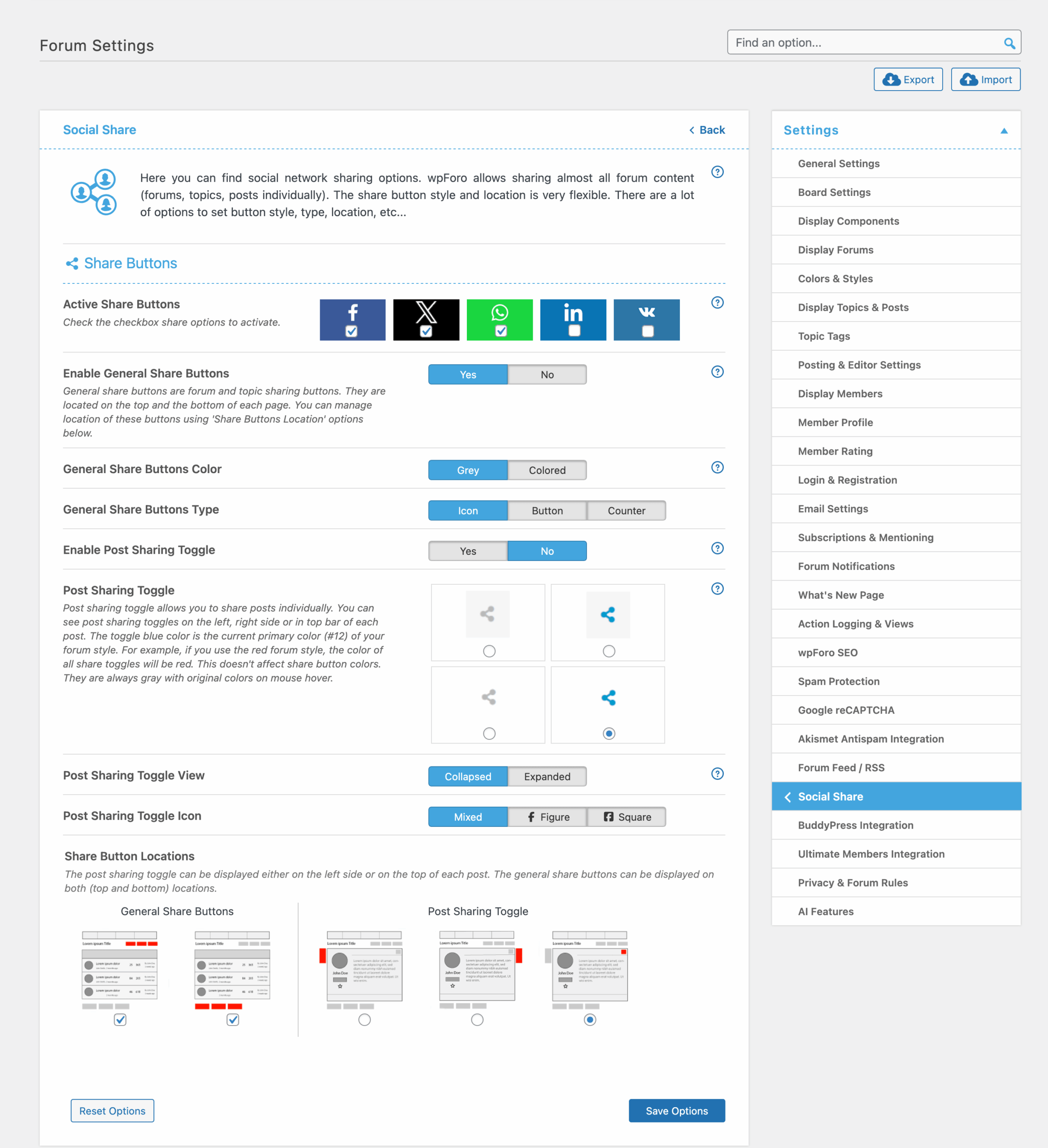 General share buttons are forum and topic sharing buttons. They are located on the top and the bottom of each page. You can manage location of these buttons using ‘Share Buttons Location’ options below this admin page.