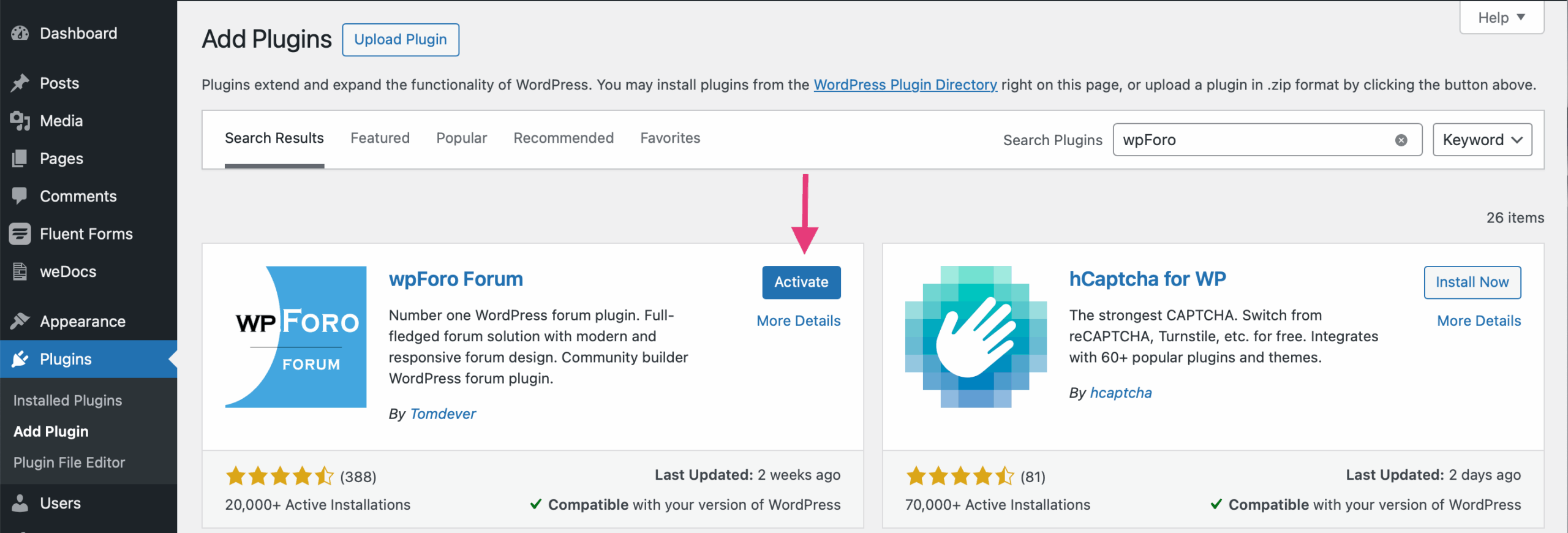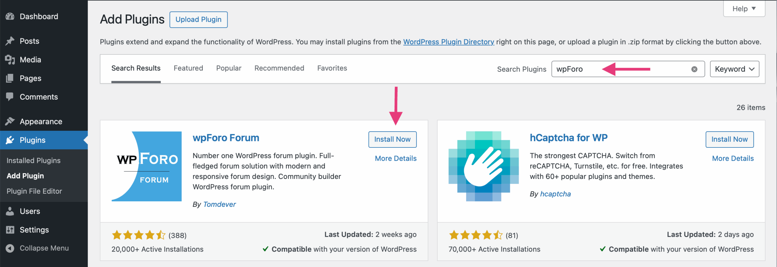 Navigate in Dashboard to Plugins admin page, click on [add new] button and search for wpForo: